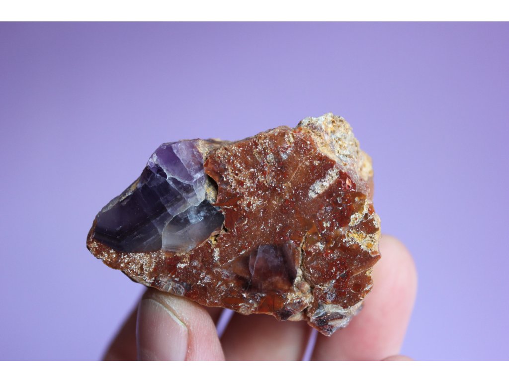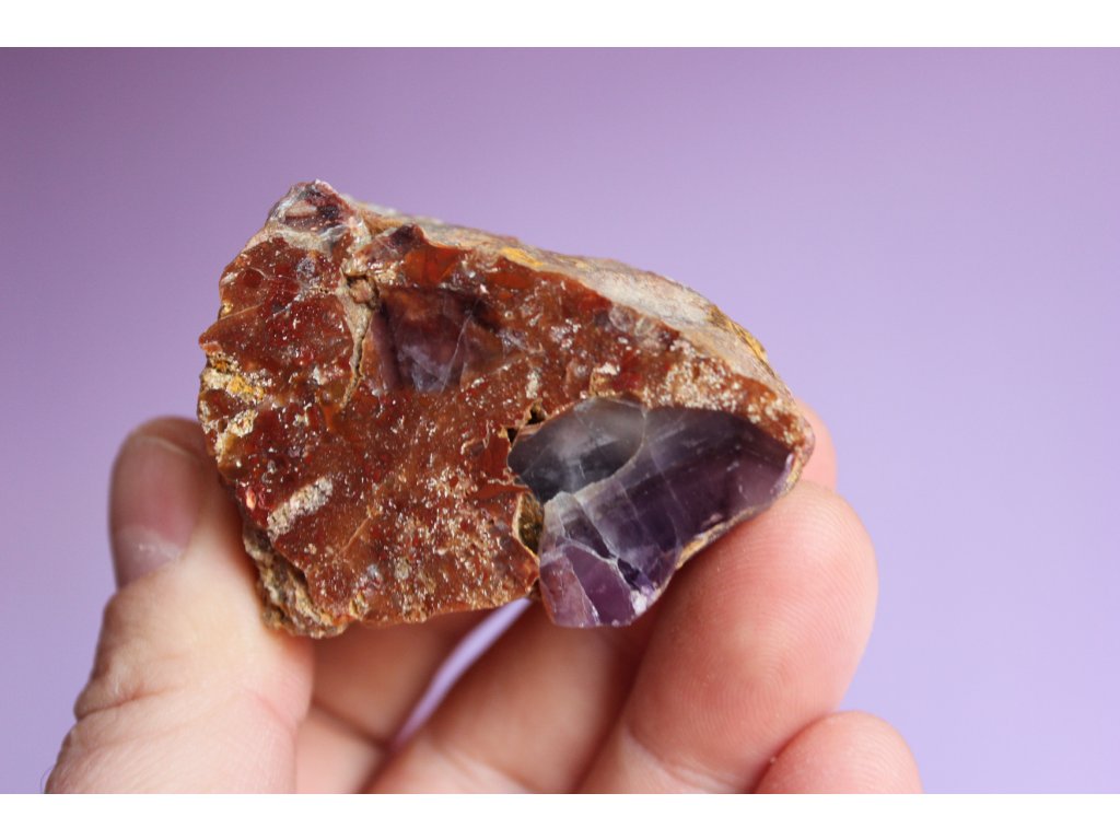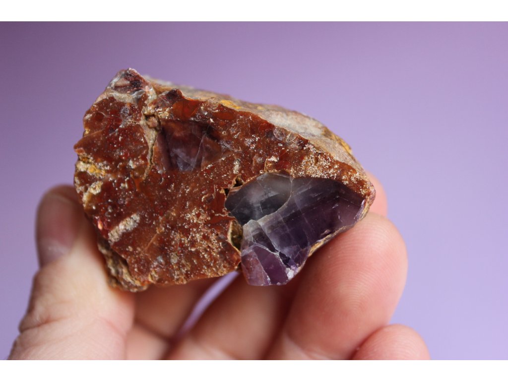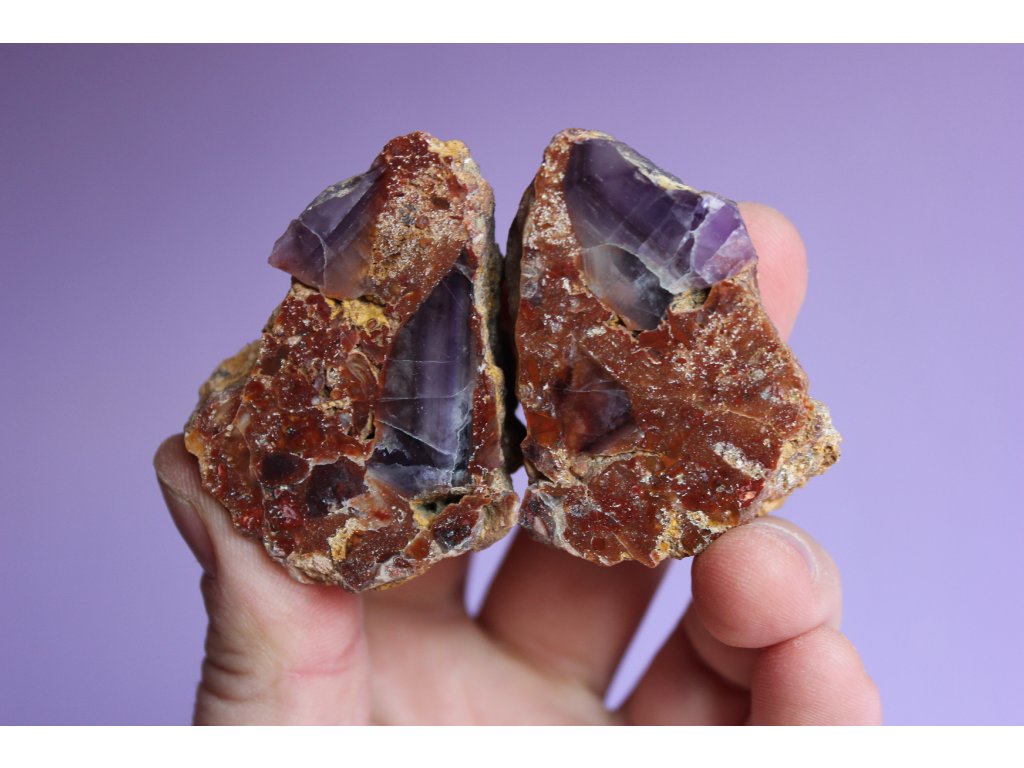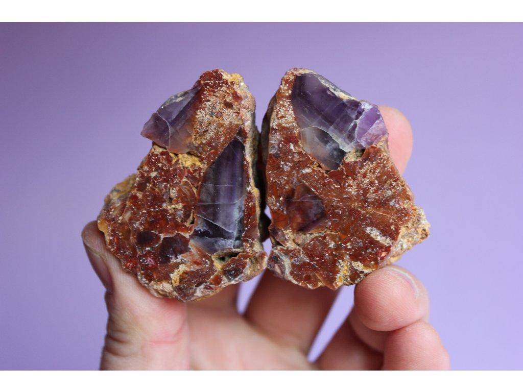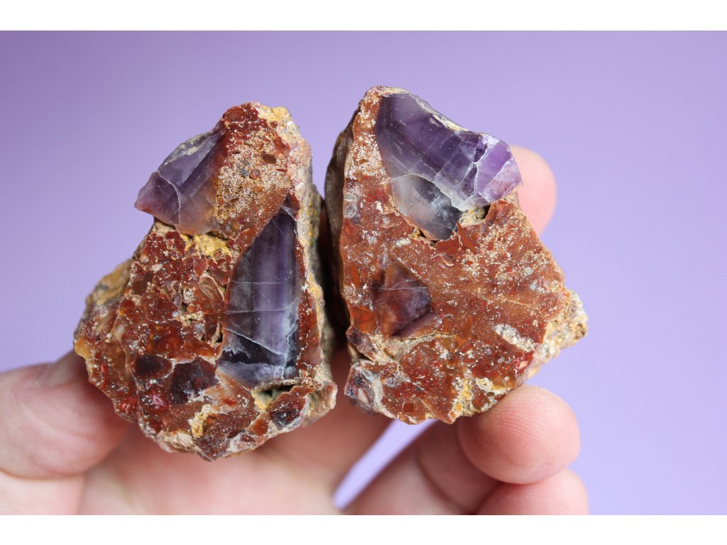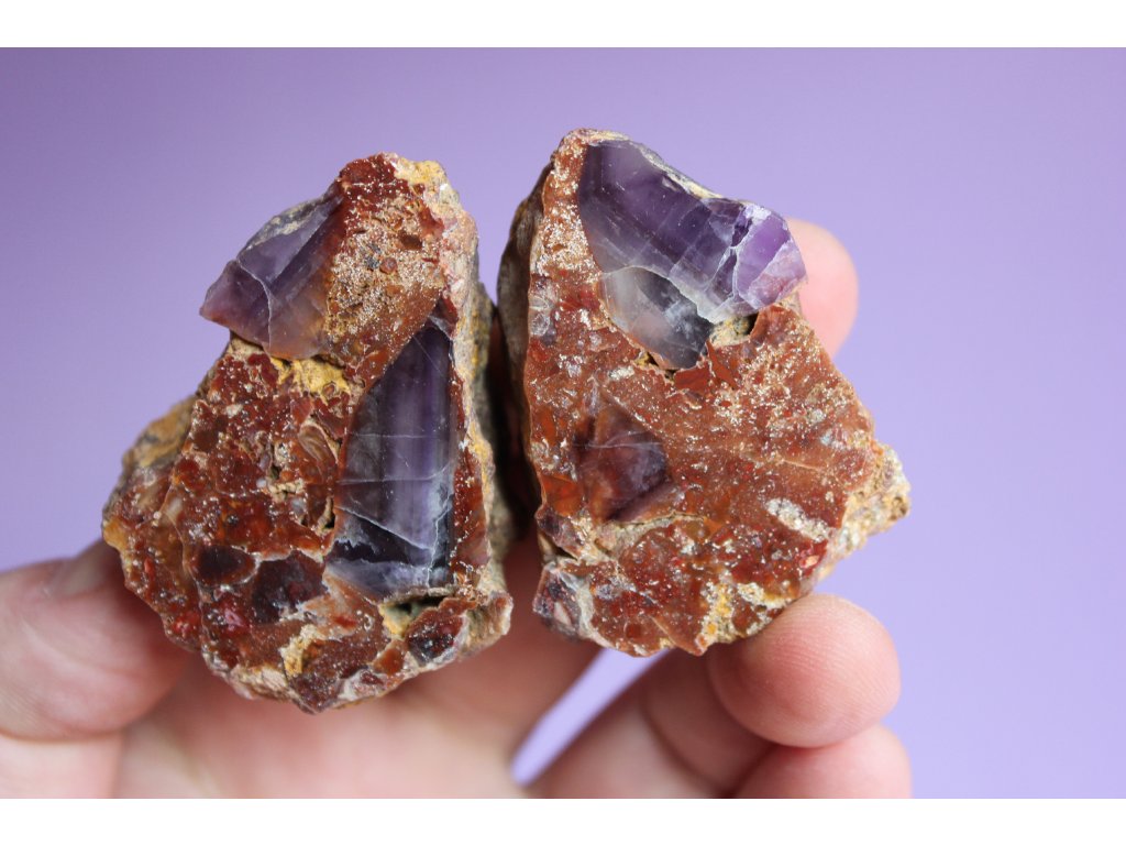 Pár zonálních ametystů v červeném jaspisu z lokality Ciboušov v Krušných Horách